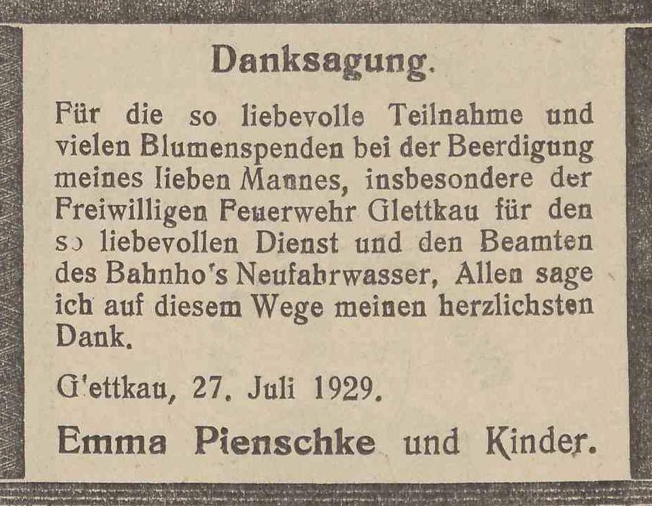 Emma Pienschke. Olivaer Zeintung nr 174 z 27. 07. 1929 r.