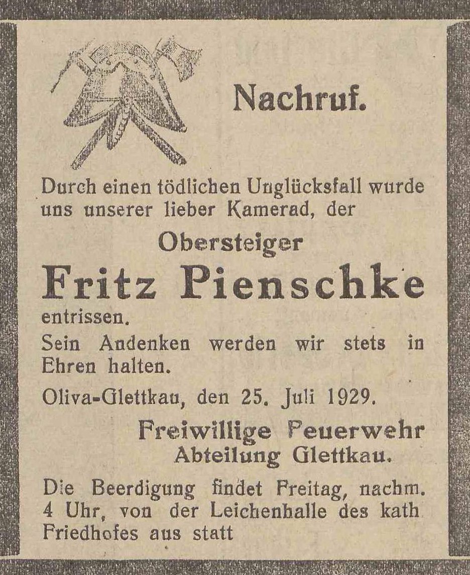 Fritz Pienschke. Olivaer Zeintung nr 173 z 26. 07. 1929 r.