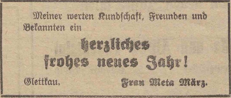 Meta März. Podziękowania noworoczne, Olivaer Zeitung nr 306 z 31. 12. 1928.