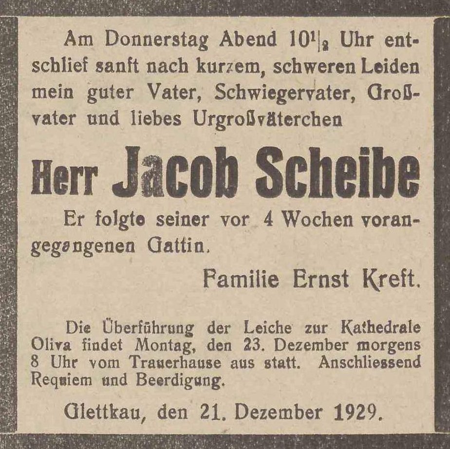 Jacob Scheibe. Ernst Kreft. Olivaer Zeintung nr 299 z 21. 12. 1929 r.