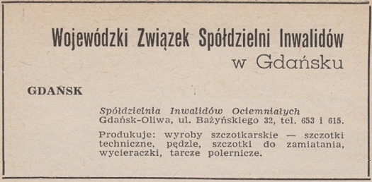 Wojewódzki Związek Spółdzielni Inwalidów w Gdańsku. Reklama z 1962 roku. Zbiory Piotra Leżyńskiego.