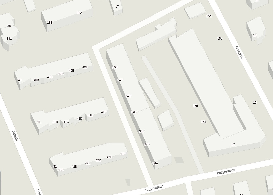 Ul. Polanki 40-42, Grottgera 15, Barzyńskiego 32, 34. Kompleks budynków wybudowanych w latach 60. XX wieku dla Spółdzielni Inwalidów Ociemniałych. Plan ze strony mapa.targeo.pl.