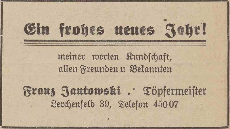 Franz Jantowski, Topfermeister. Podziękowania noworoczne, Olivaer Zeitung nr 306 z 31. 12. 1928.