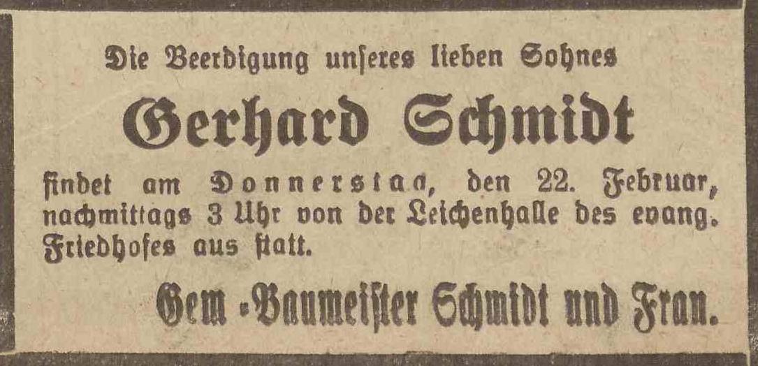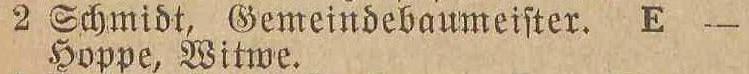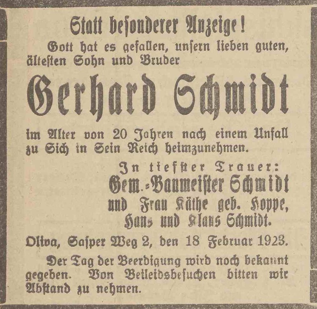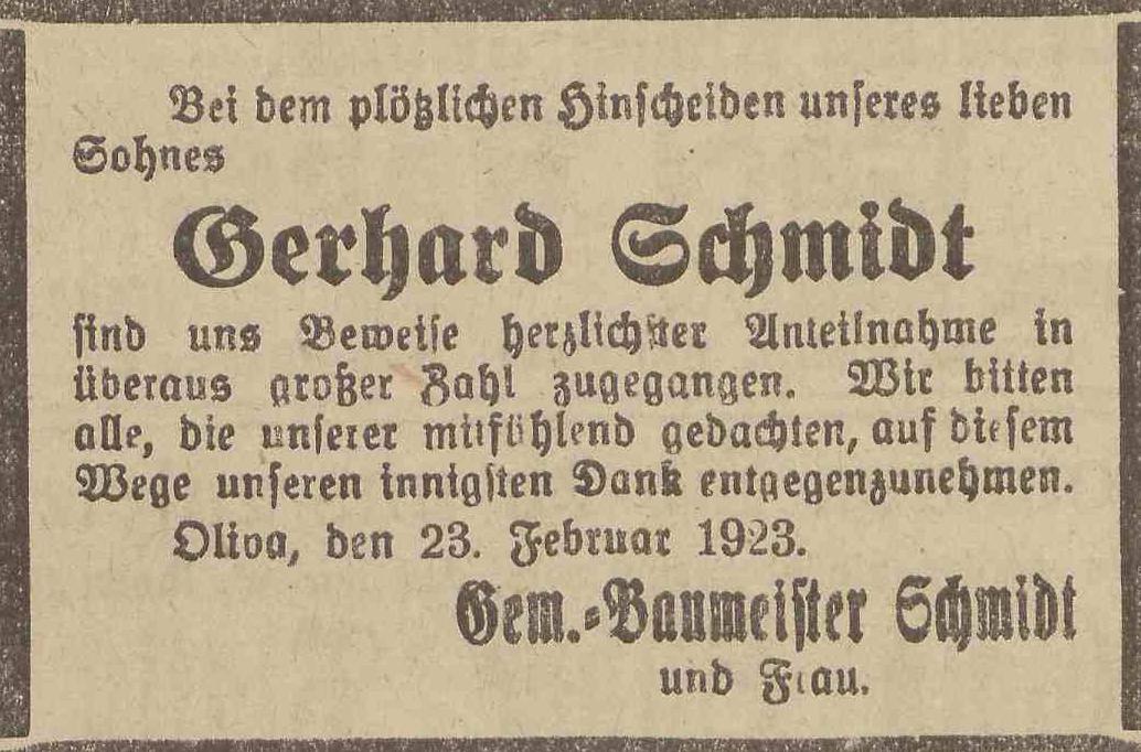 Gerthard Schmidt (zmarł w wieku 20 lat). Waldemar Schmidt, Gemeide-Baumeister. Käthe Schmidt zd. Hoppe. Hans . Klaus Schmidt. Olivaer Zeintung nr 43 z 20. 02. 1923 r.