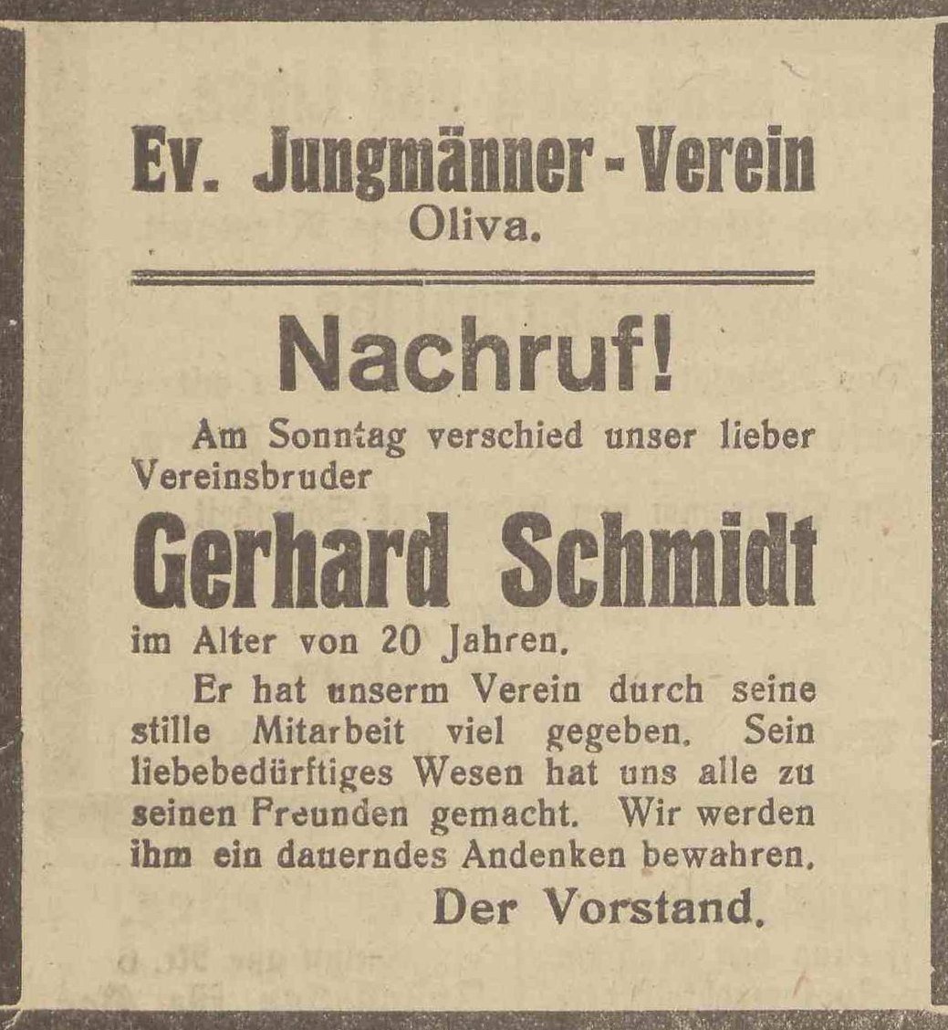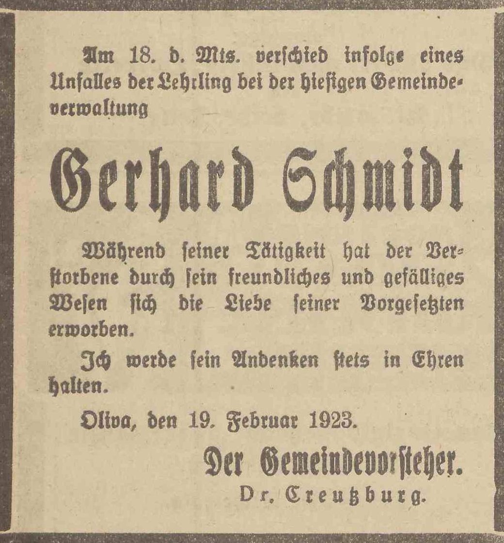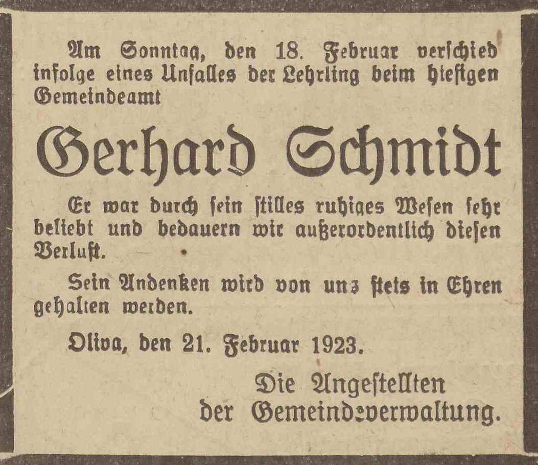 Gerthard Schmidt. Olivaer Zeintung nr 43 z 20. 02. 1923 r.