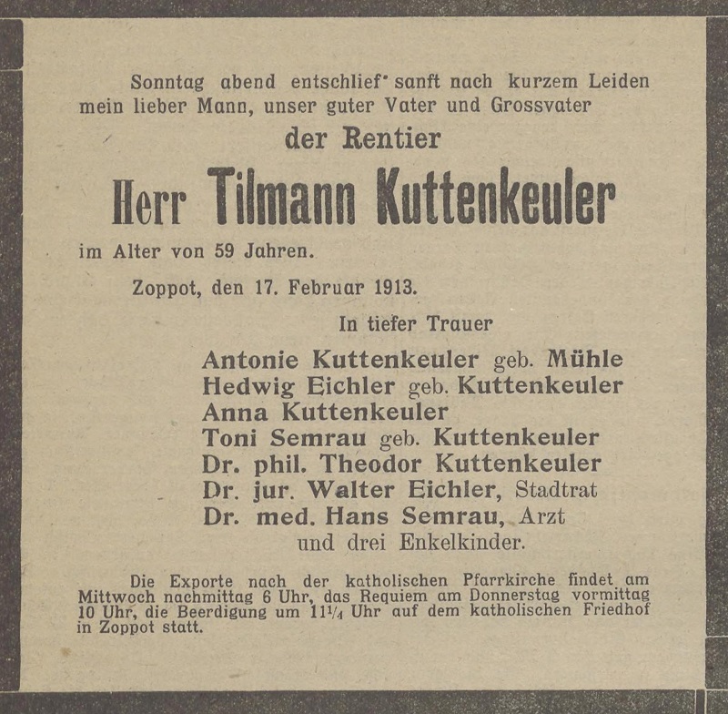 Tillmann Kuttenkeuler. Olivaer Nachrichten nr 21 z 20. 02. 1909 r. Ze strony Polona.pl.