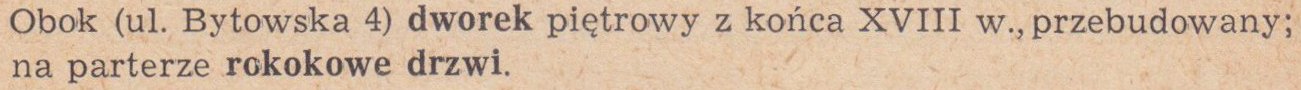 Obok (ul. Bytowska 4) dworek piętrowy z końca XVIII w., przebudowany; na parterze rokokowe drzwi. F. Mamuszka, J. Stankiewicz, "Oliwa. Dzieje i zabytki", Gdańsk 1959.