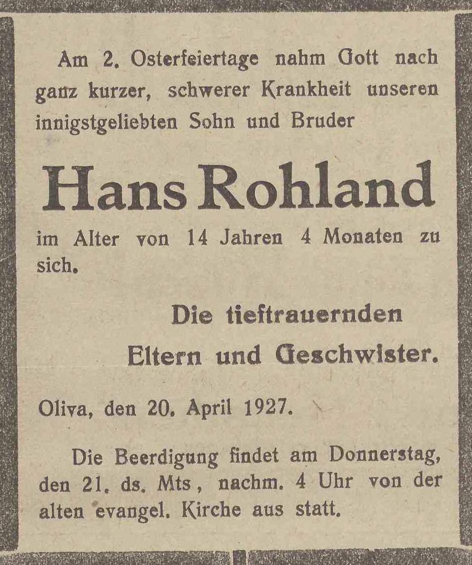Hans Rohland. Olivaer Zeintung nr 91 z 20. 04. 1927 r.