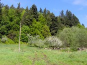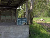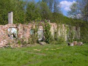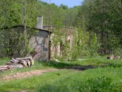 Zabudowania byłej fermy lisów. Widok ze ścieżki w Dolinie Radości w kierunku północnym. Po prawej nieistniejące dziś (2011) ogrodzenie jednego z dwóch ogródków działkowych. Fotografię wykonałem 26 maja 2005 roku.