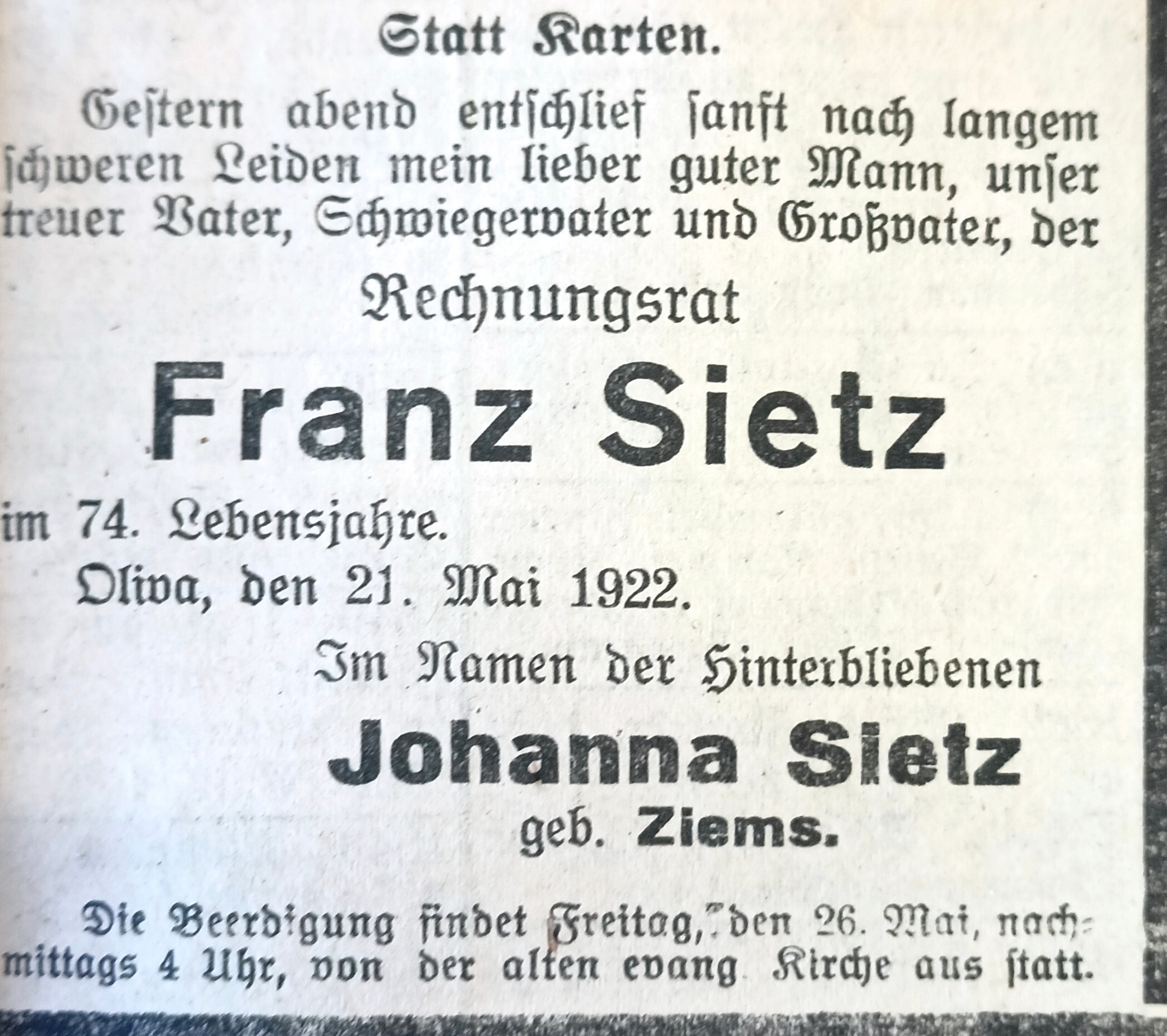 Franz Sieds Johanna Sietz zd. Ziems. Danziger Kreis-Zeitung 1922. Przekazała Grażyna Niemyjska.