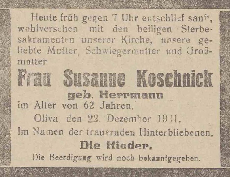 Susanne Koschnick zd. Herrmann. Danzig-Olivaer Zeintung nr 299 z 22. 12. 1931 r.