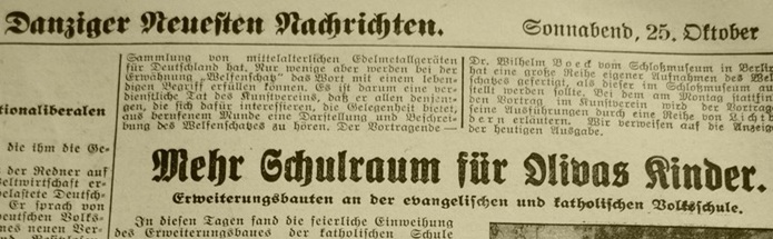 Tzw. "Szkoła biała" w Oliwie, wzniesiona ok. 1905 roku, była szkołą katolicką. Ewangelicka "Szkoła czerwona" została zbudowana ok 1904 roku, a modernistyczną dobudówkę dodano 26 lat później. To właśnie z 1930 roku pochodzi poniższy wycinek prasowy.