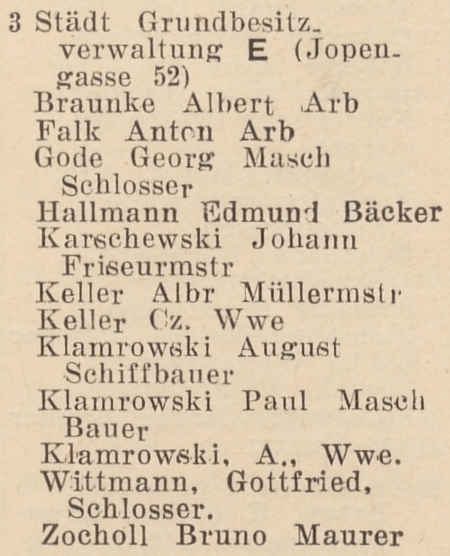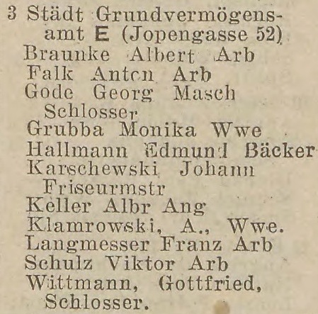 Budynek pochodzi, co najmniej z końca XIX wieku. Przedstawiony był na pocztówce wydawnictwa Dr. Trenkler & Co. wydanej w 1899 roku (nr 8371). W latach 30 XX wieku dom należał do Michała i Moniki Grubby. Mieszkał tu również piekarz Edmund Hallmann, który być może prowadził piekarnię. Około 1940 roku dom przejął Gdański Urzędu Nieruchomości (Städt Grundvermögensamt). Pani Monice pozwolono pozostać w swoim mieszkaniu (1942).