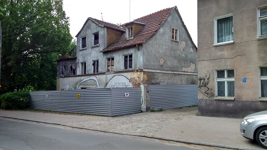 Od kilku miesięcy (fot. z maja 2015 r.) dom otoczony jest blaszanym płotem z tabliczkami: "uwaga roboty budowlane" i "teren prywatny wstęp wzbroniony".