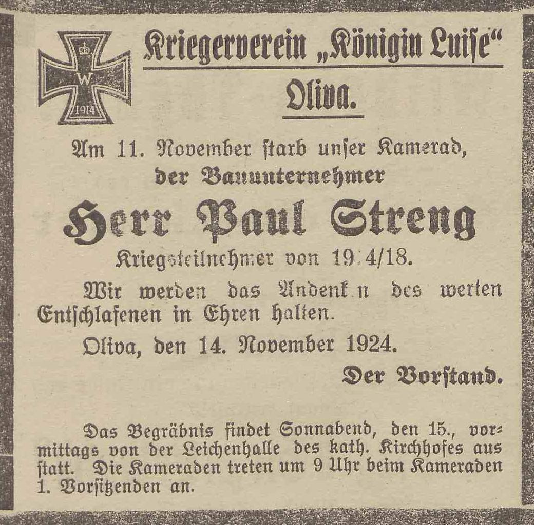 Paul Streng. Olivaer Zeintung nr 268 z 14. 11. 1924 r.
