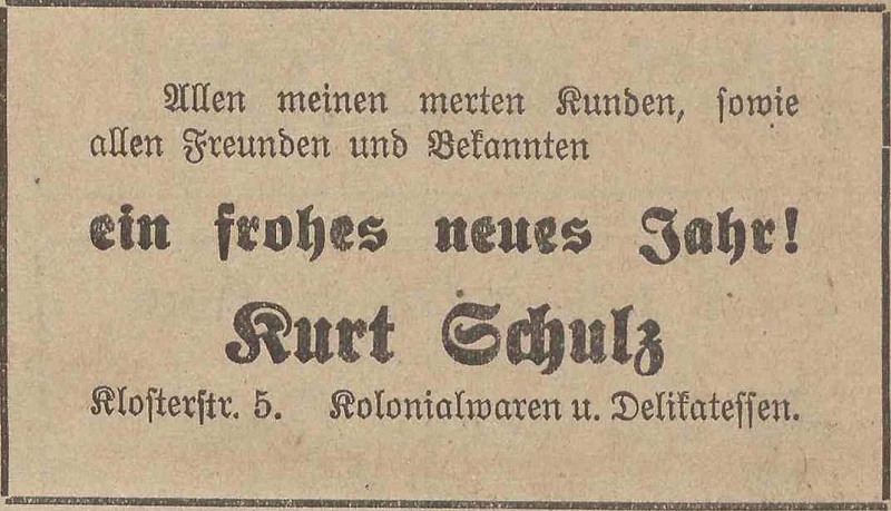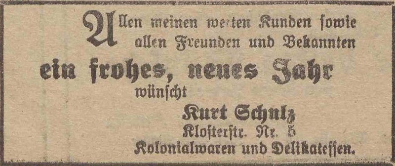 Kurt Schulz, Kolonialwaren und Delikatessen. Podziękowania noworoczne, Olivaer Zeitung nr 306 z 31. 12. 1928.