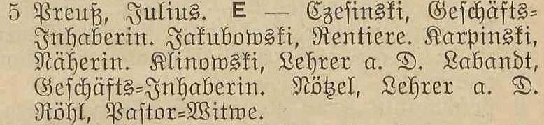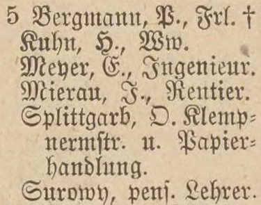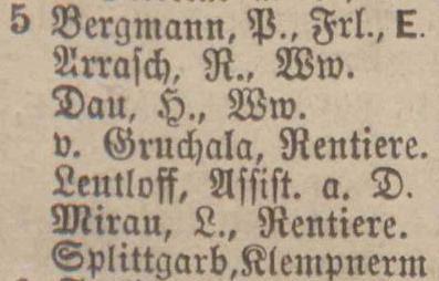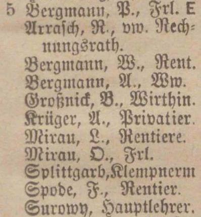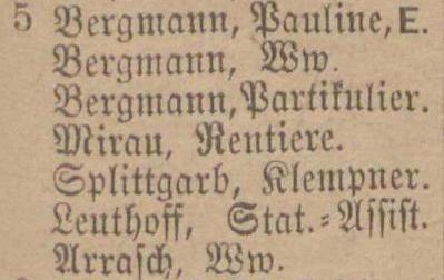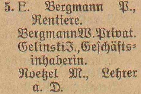 Bergmann, Anna, geb. Freudi, Ww. Bergmann, Panline, Hausbesikerin. Dobberstein, Bruno u. Franz, Bens. Fischer, Hulda, Lehrerin. Groß, Rudolf, Ober-Postsecretair. Meyer, Ernst, Schiffs-Ingenieur. Mirau, Jacob, Rentier. Puttkammer, Elisabeth, geb. Liedtfe.