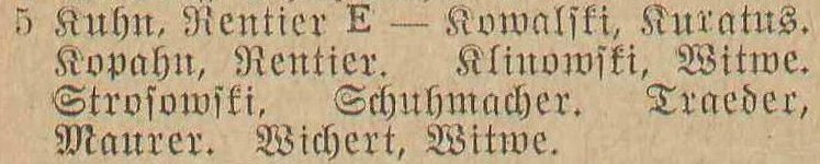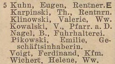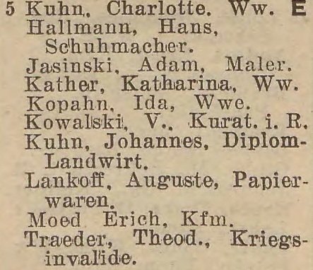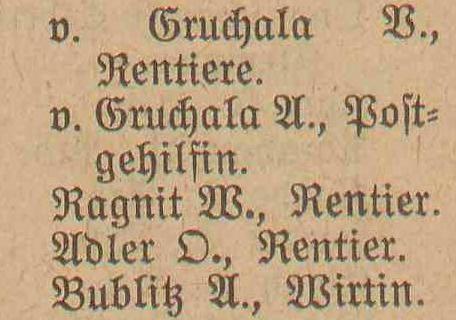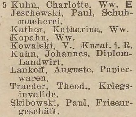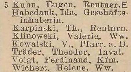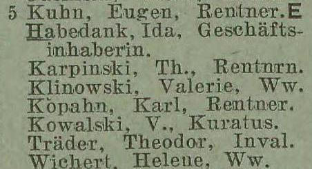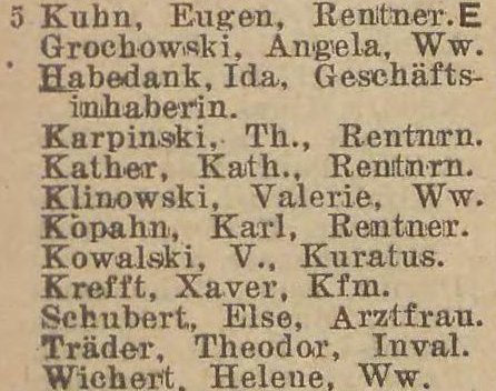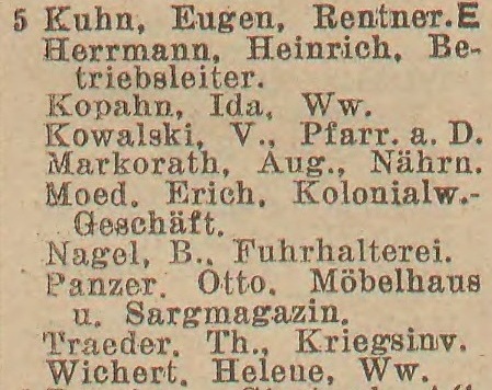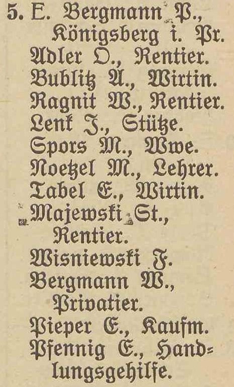 Bergmann, Anna, geb. Kreucki. Bergmann, Pauline, Hausbesitzerin. Dobberstein, Bruno und Franz, Pens. Fischer, Hulda, Lehrerin. Groß, Rudolf, Ober-Postsefretär. Kuhn, Helene, geb. Anoch, Rendant.-Ww. Meyer, Ernst, Schiffs-Ingenieur. Mirau, Jakob, Rentier.