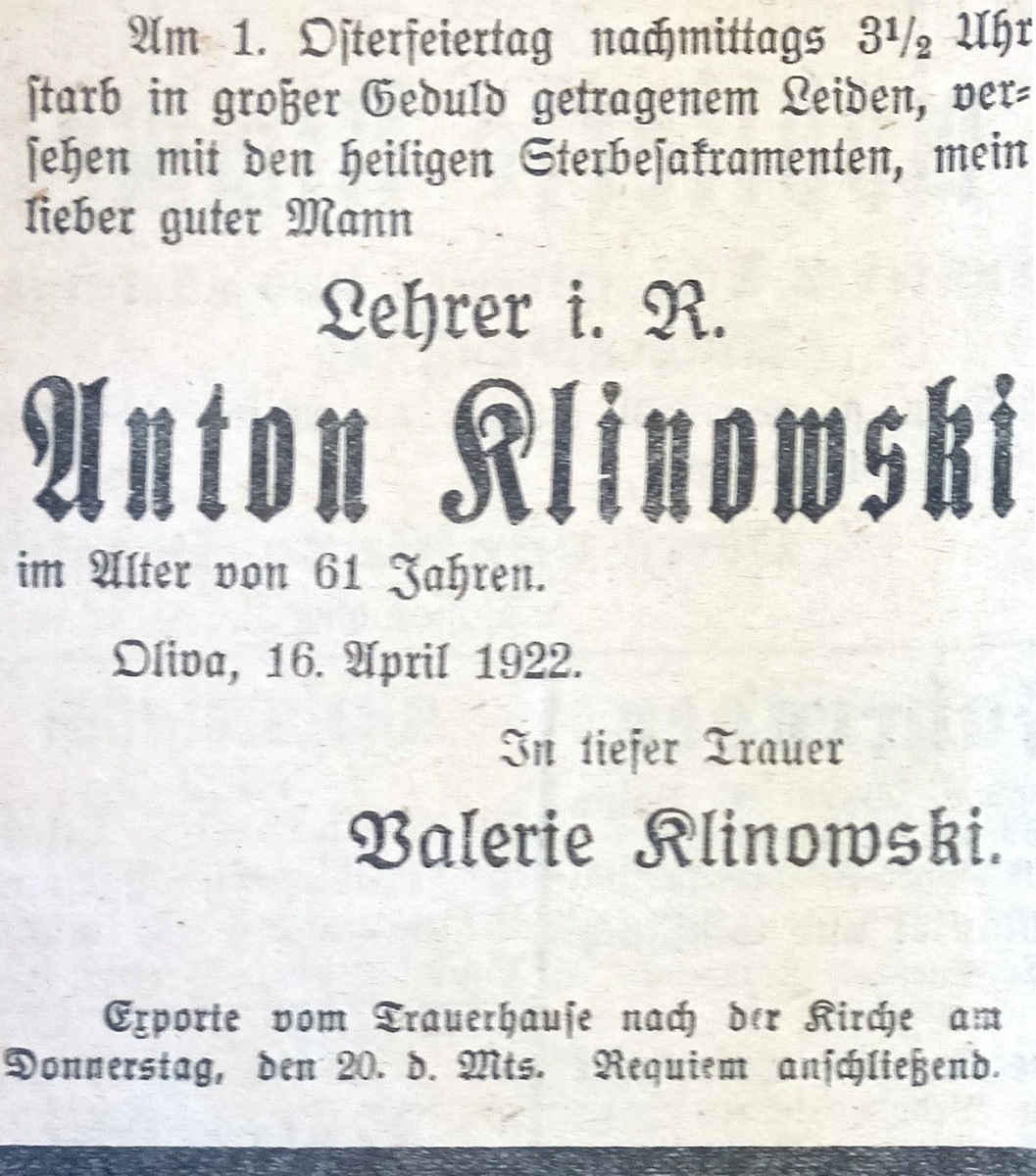 Anton Klinowski. Valerie Klinowski. Danziger Kreis-Zeitung 1922. Przekazała Grażyna Niemyjska.