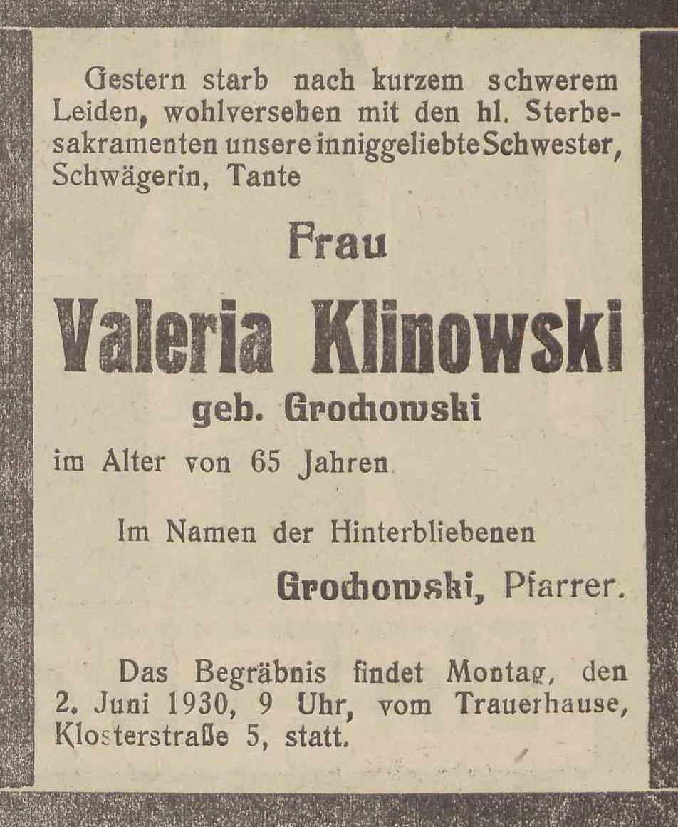 Valeria Klinowski zd. Grochowski. Pfarrer Grochowski. Danzig-Olivaer Zeintung nr 28 z 31. 05. 1930 r.