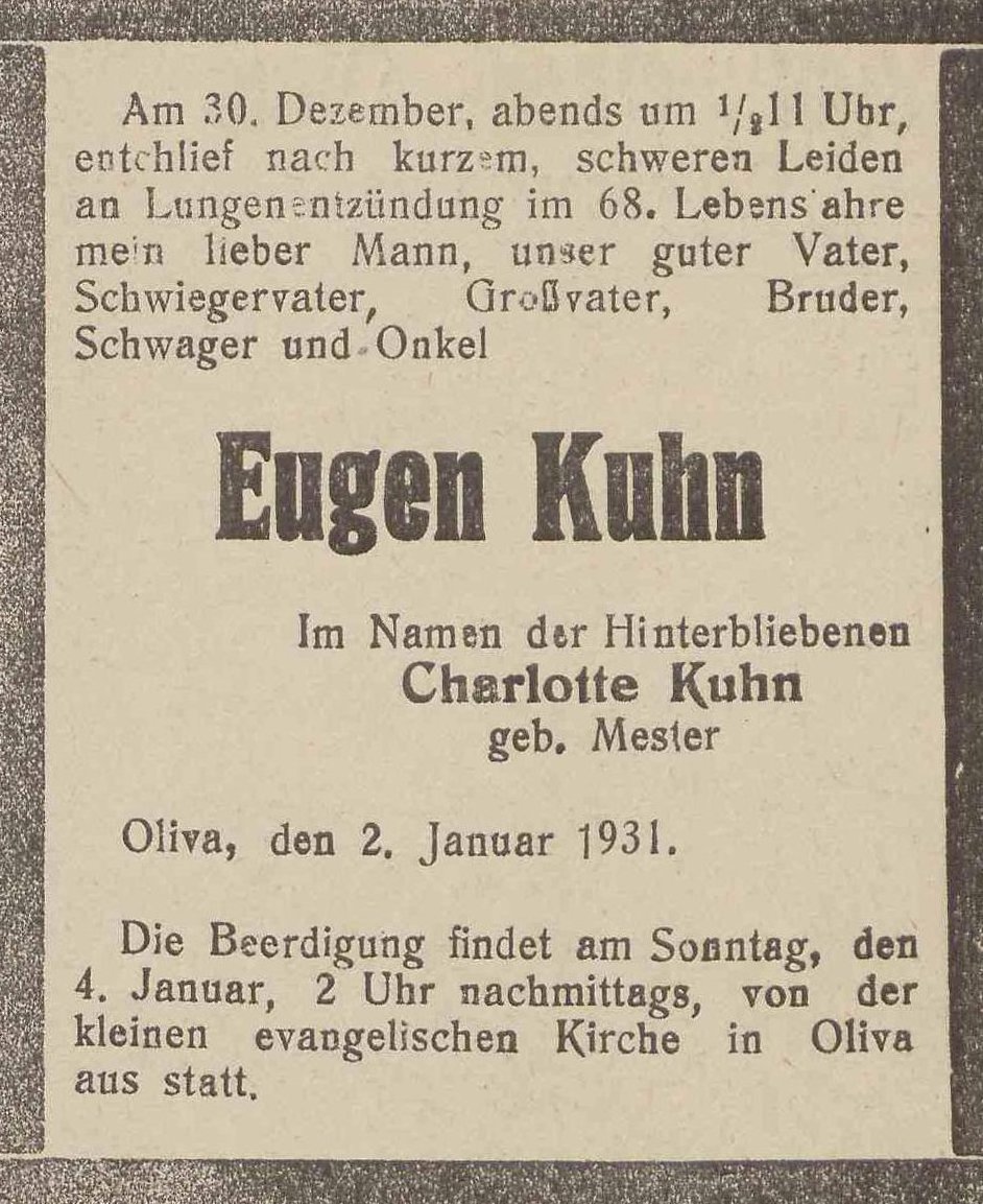 Eugen Kuhn. Charlotte Kuhn zd. Mester. Danzig-Olivaer Zeintung nr 1 z 02. 01. 1931 r.