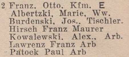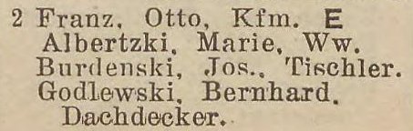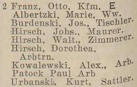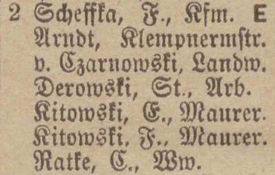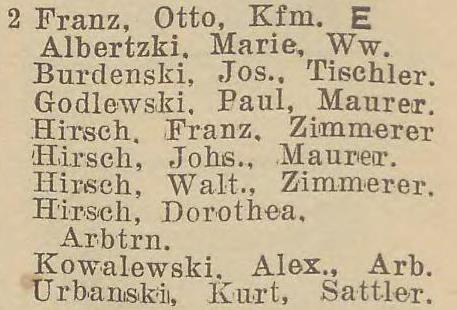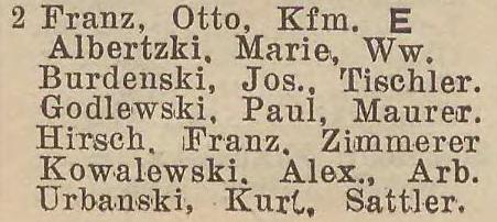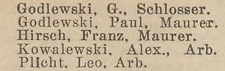 Antoni Abraham, Marie Albertzki, B. Burdenski, Johs. Burdenski, Albert Dorlowski, Paul Godlewski, G. Godlewski, Bernhard Godlewski, John. Hirsch, Franz Hirsch, Walter Hirsch,