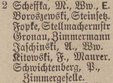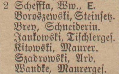 Dorothea Hirsch, Jularczyck, Alex. Kowalewski, Franz Lawrenz, Johann Lawrenz, Martin, Franz Otto, Paul Patock, Leo Plicht, Saborowski, Schendel, Frz. Schimikowski,