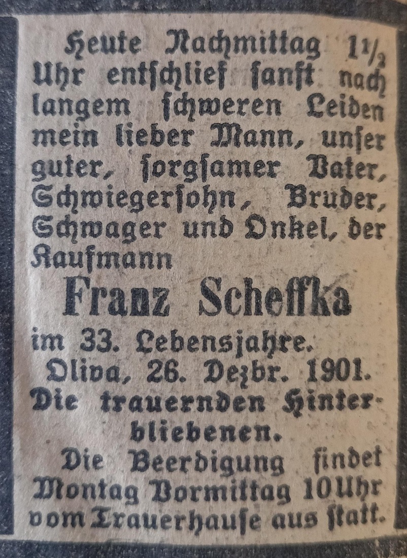 Franz Scheffka. 26. 10. 1901. Olivaer Nachrichten z 1901 roku. Przekazała Grażyna Niemyjska.
