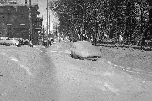 Zaśnieżona ulica Czyżewskiego w Oliwie. "Zima stulecia". Fot. z 1979 roku. Po lewej buyunek nr 6. Fot. Ryszard Petrajtis.