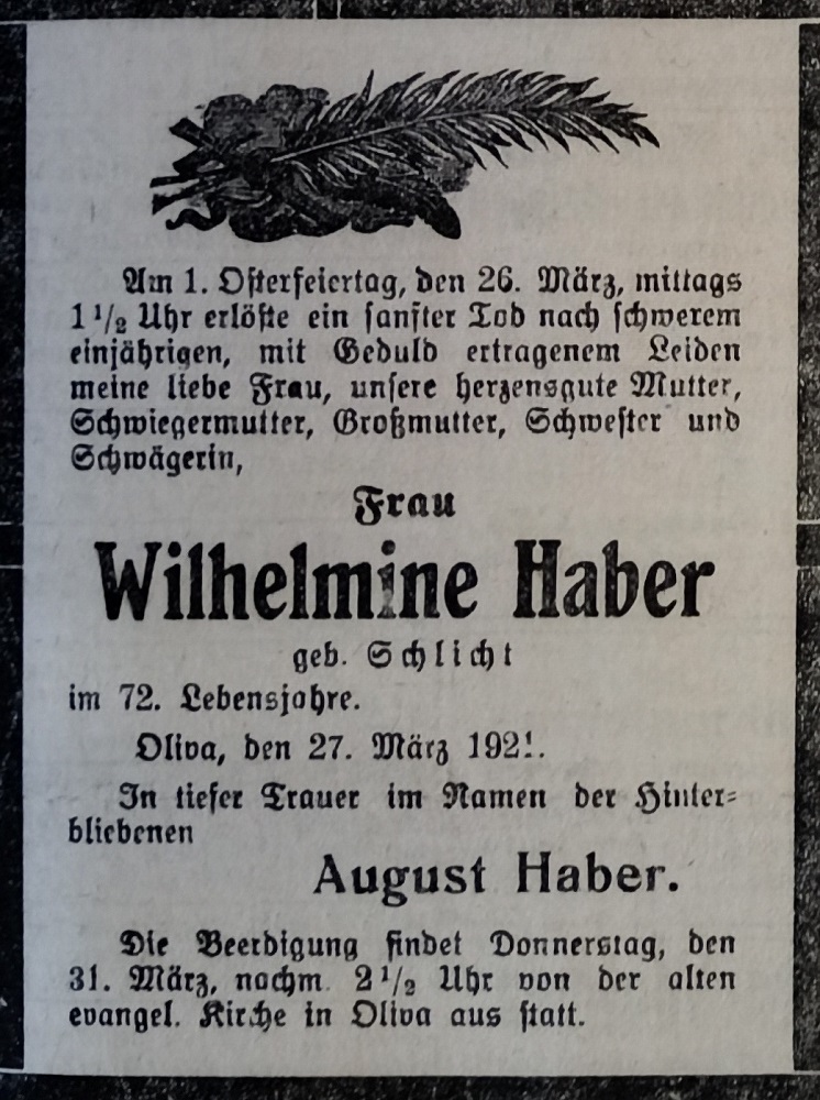Wilhelmine Haber zd. Schlicht. August Haber. Danziger Kreis-Zeitung 1921. Przekazała Grażyna Niemyjska.