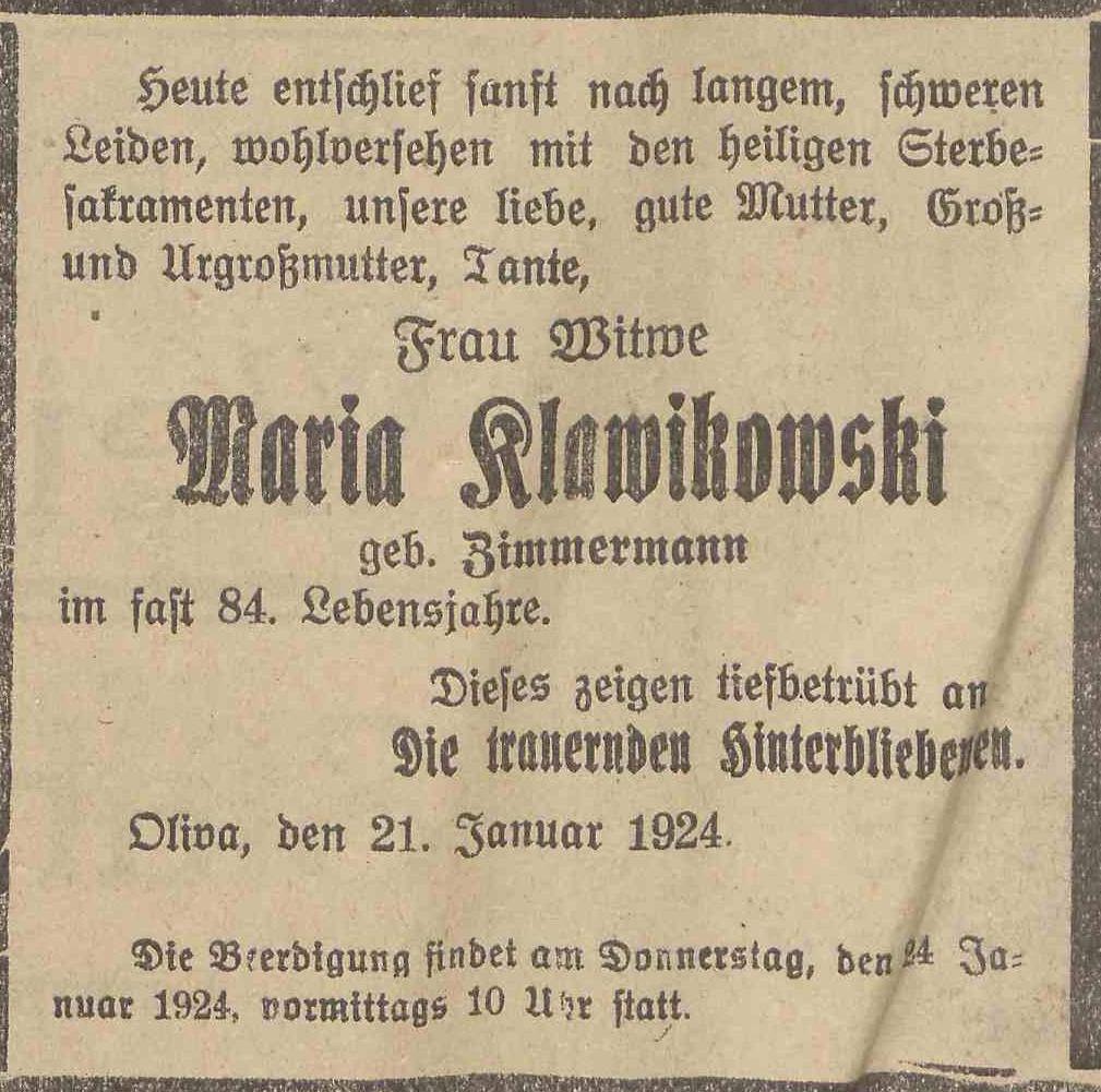 Maria Klawikowski zd. Zimmermann zmarła w wiwku 84 lata. Olivaer Zeintung nr 18 z 22. 01. 1924 r.