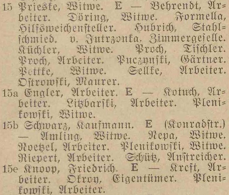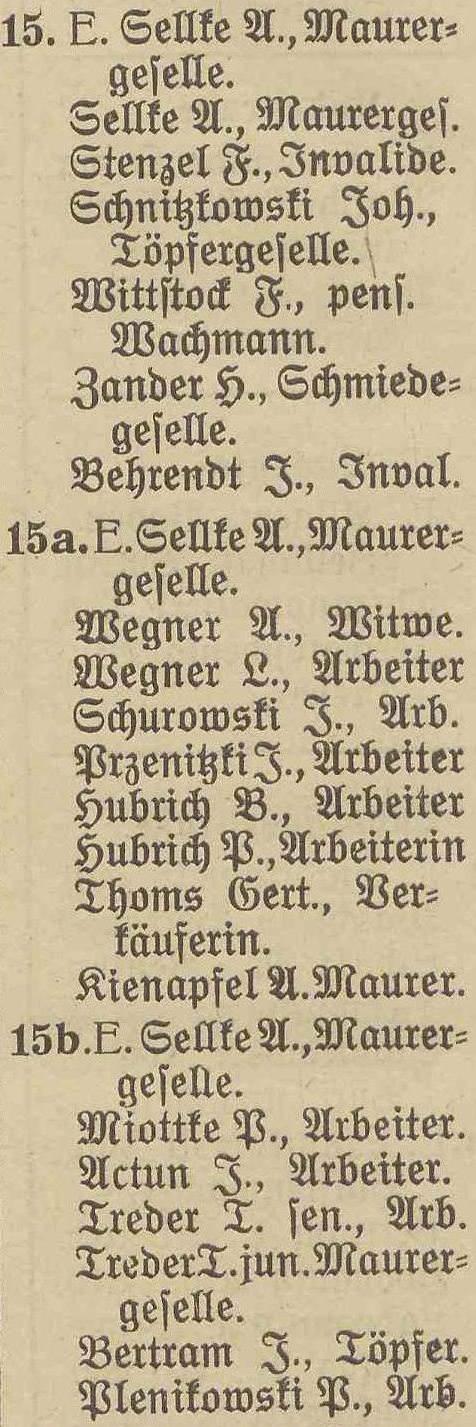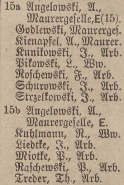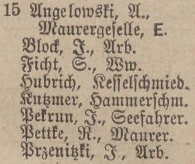 Angelowski, Aug., Eigenth. u. Maurer. Grönkowski, August, Maurer. Hubrig, Benjamin, Stahlschmied. Jaschinski, Victor, Zimmermann. Pusch, Carl, Hammerschmied. Retzki, Eduard, Arbeiter. Roschewski, Franz, Arbeiter.