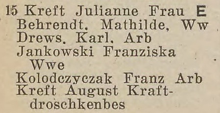 Adres: Ludolfiner Straße 15. Julianna Kwiatke zd. Targa (ur. 1866, zm. 26.08.1941 - osłabienie serca). Źródło: , 08.1941 poz. 71.