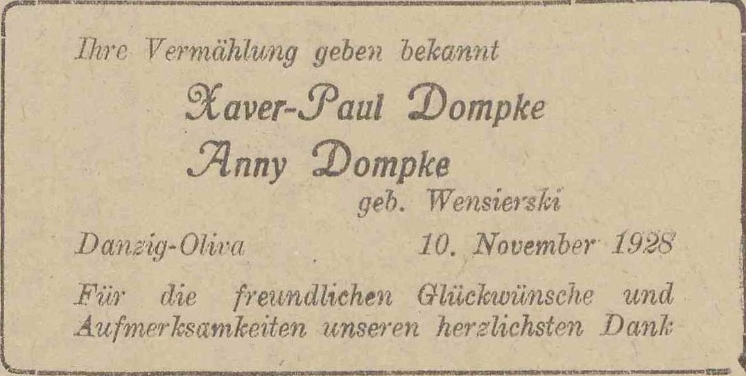 Xaver Paul Dompke. Anny Dompke zd. Wensierski. Olivaer Zeintung nr 267 z 12. 11. 1928 r.