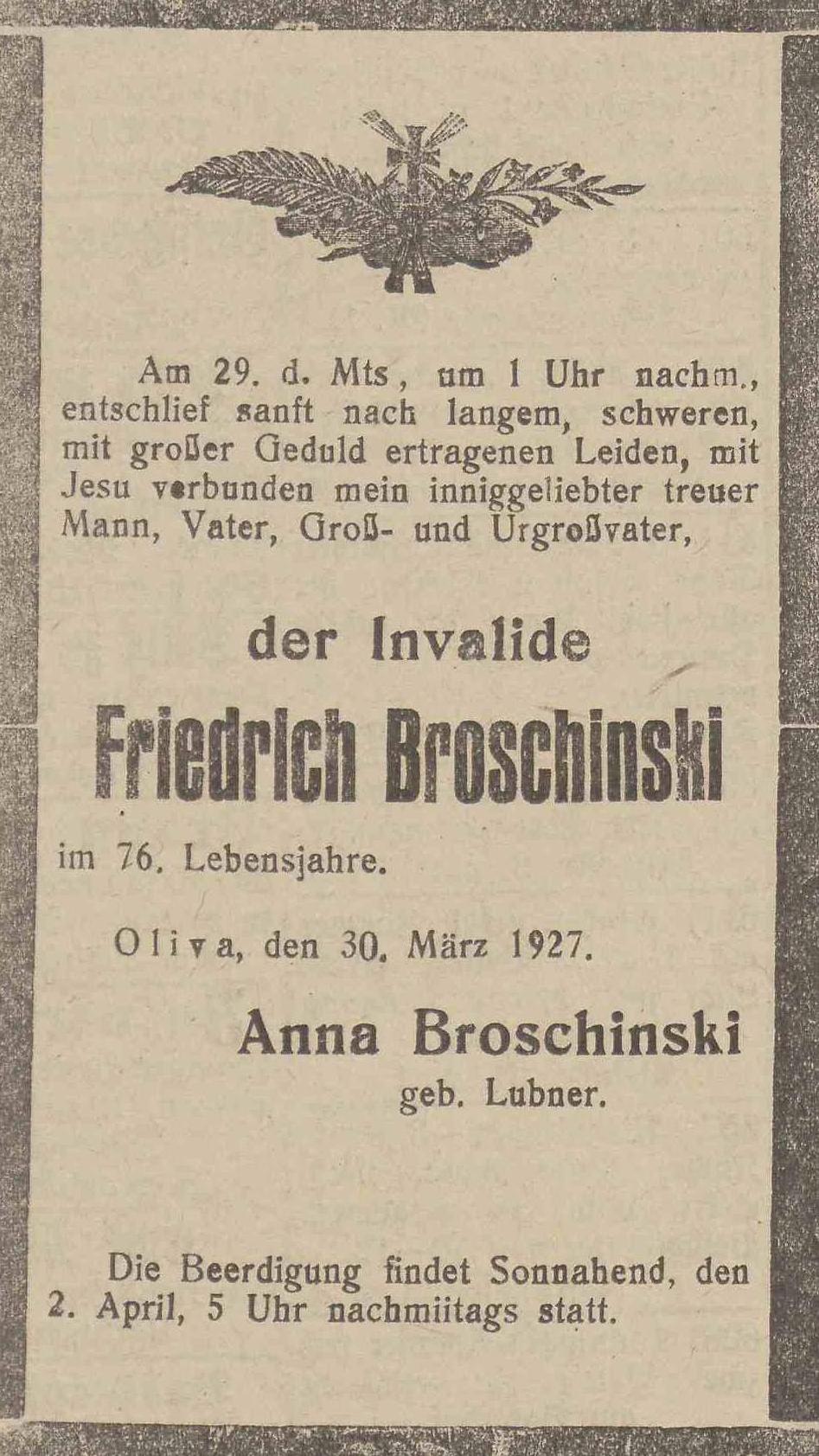 Friedrich Broschinski. Anna Broschinski zd. Lubner. Olivaer Zeintung nr 31 z 76. 03. 1927 r.