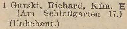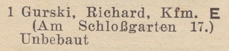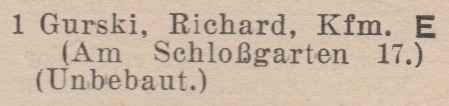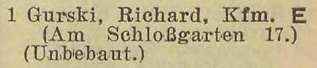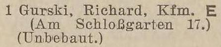 Działka niezabudowana, do co najmniej 1942 roku. Około 1931 roku jej właścicielem był Walter Gestrich. Przed 1933 rokiem właścicielem niezabudowanej działki został Richard Gurski zamieszkały przy Am Schloßgarten 17 (ul. Rybińskiego).
