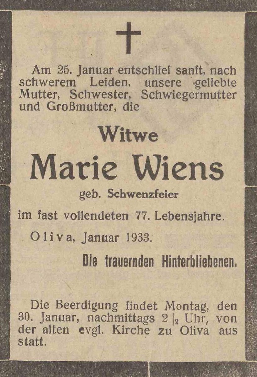 Wdowa Marie Wiens z domu Schwenzfeier. Danzig-Olivaer Zeintung nr 23 z 27. 01. 1933 r.