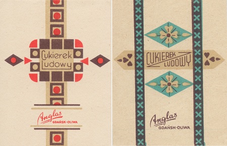 Opakowania od dropsów przedwojennej fabryki Anglas z przybitą pieczątką: "Państwowa Fabryka Cukierków, ... nr 5". Zbiory: Piotr Leżyński / Mirosław Piskorski.