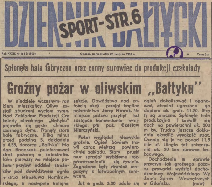 W dniu 21 sierpnia 1983 roku (niedziela) w zakładzie nr 1 (Oliwa) wybuchł pożar.