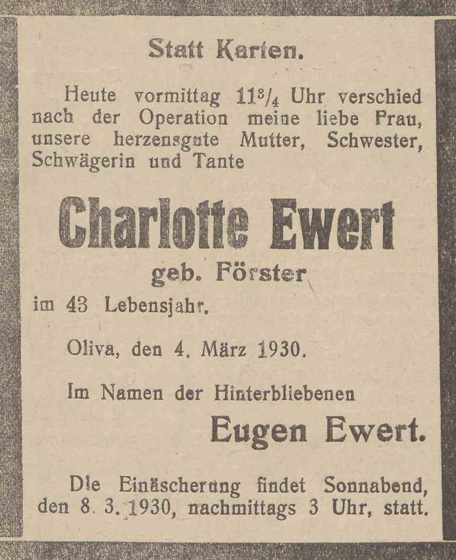 Charlotte Ewert zd. Förster. Eugen Ewet. Olivaer Zeintung nr 54 z 05. 03. 1930 r.