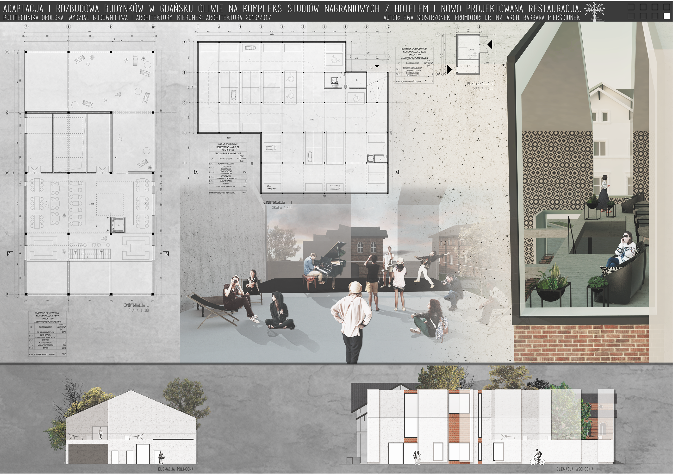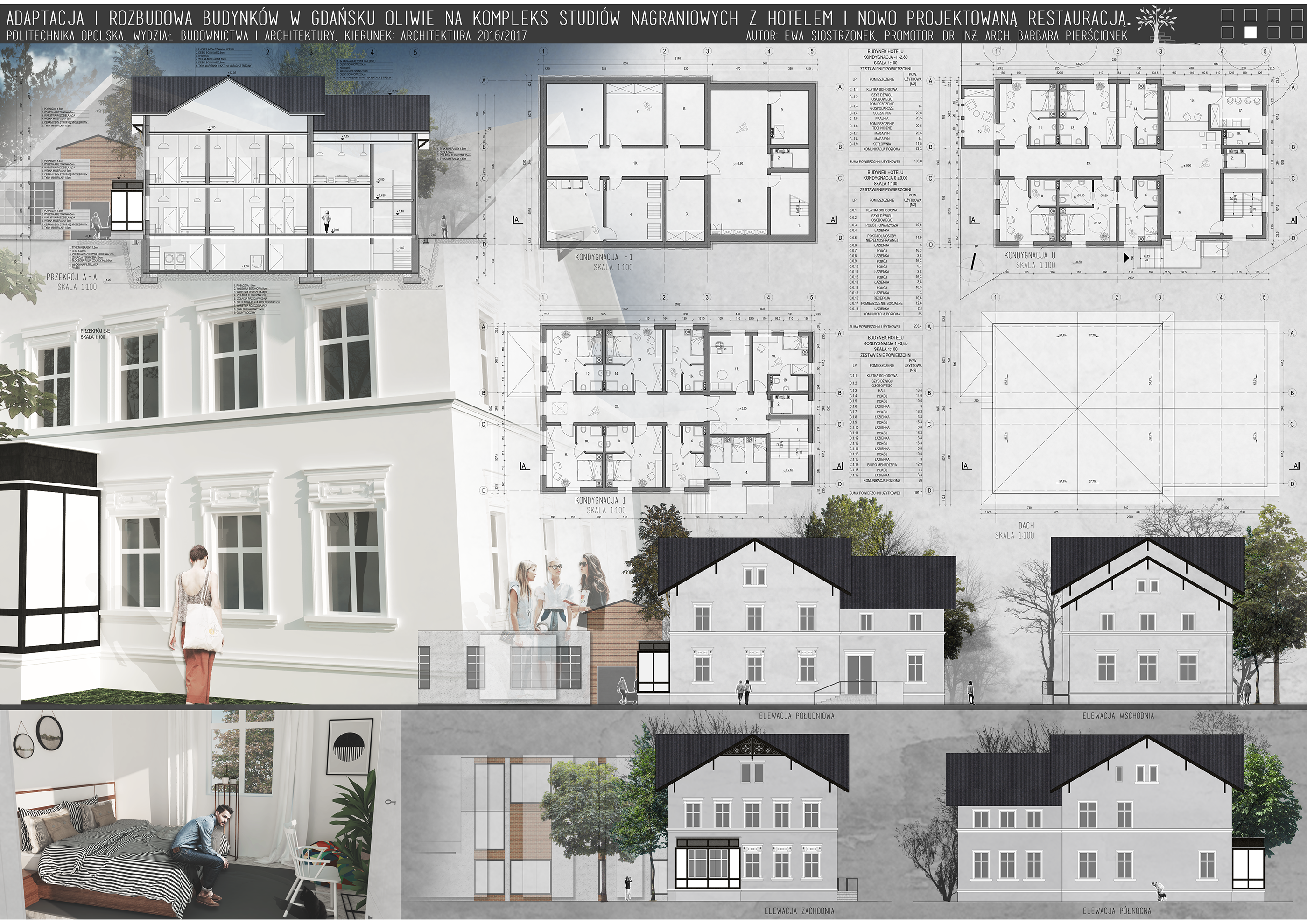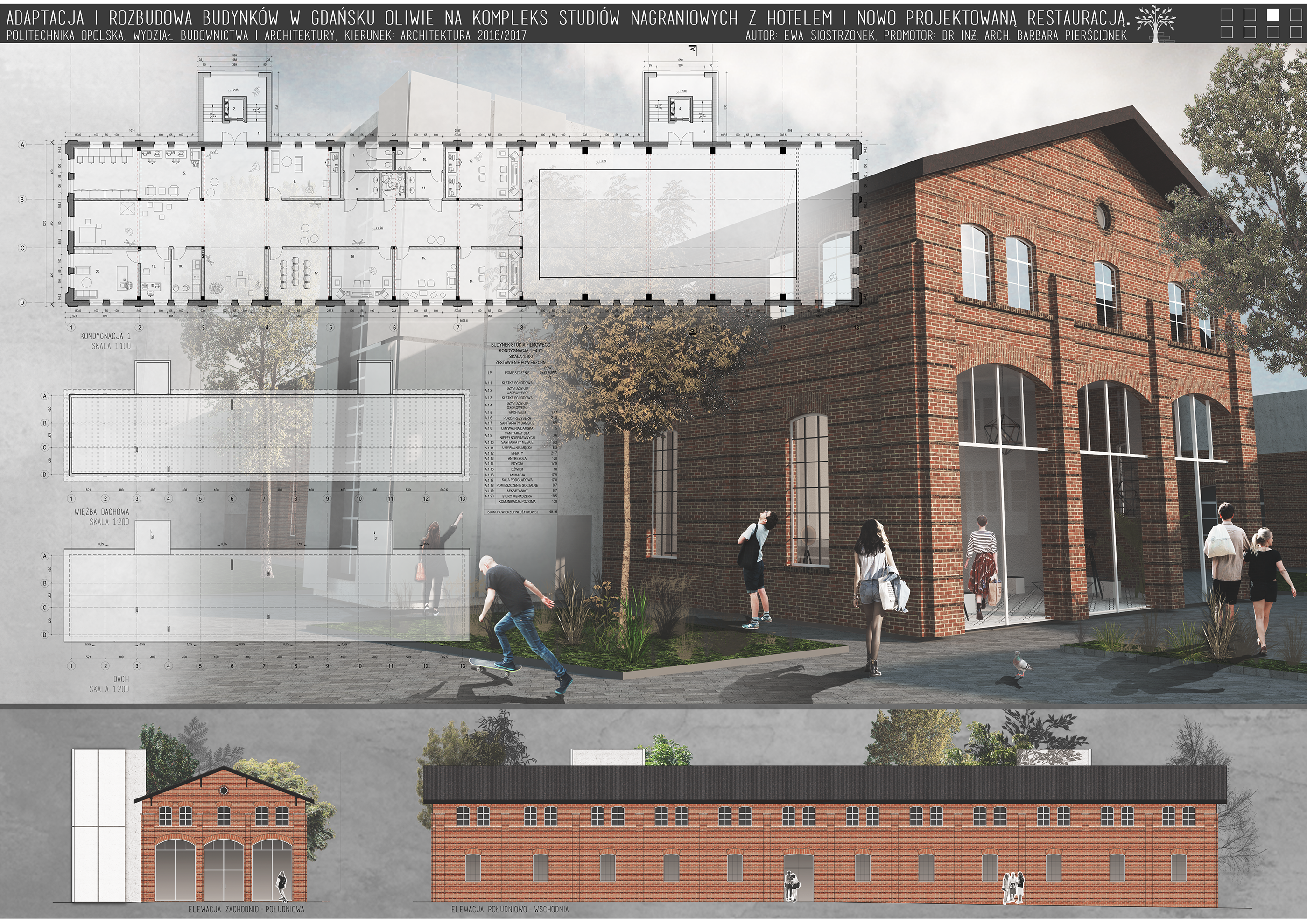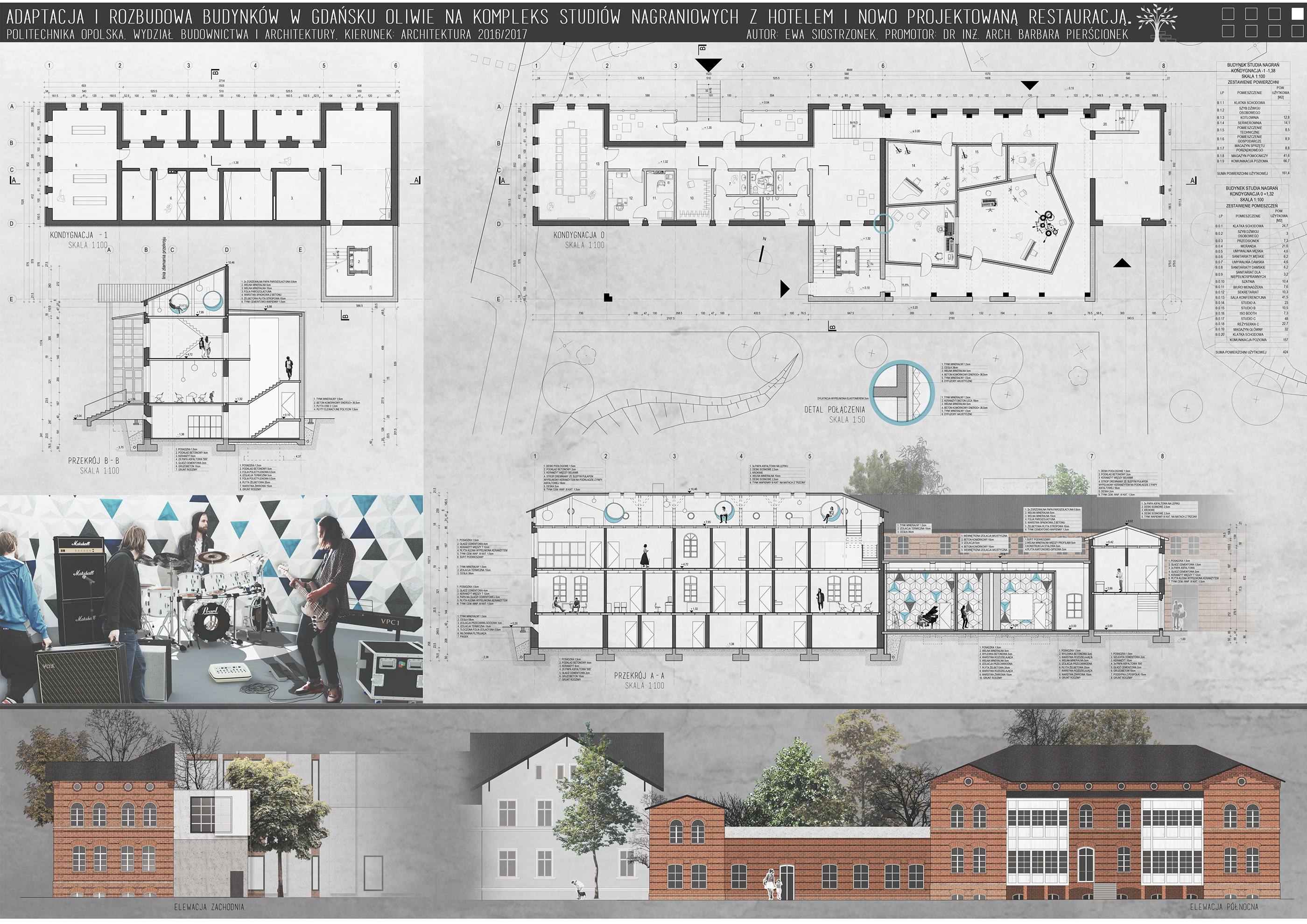 Siostrzonek E., "Adaptacja i rozbudowa budynków w Gdańsku Oliwie na kompleks studiów nagraniowych z hotelem i nowo projektowaną restauracją", Opole 2017: