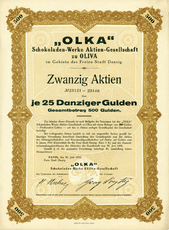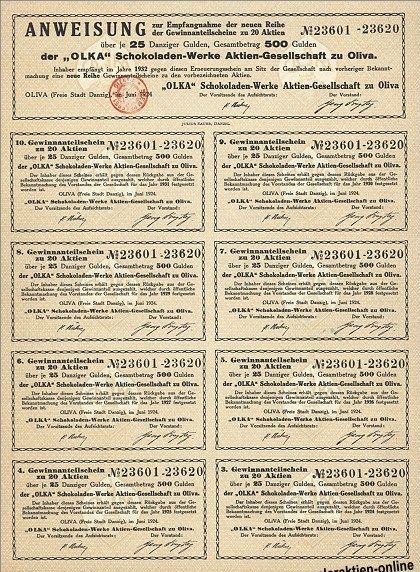 unter Nr. 822 die Aktiengefelifchaft in Firma "Olka", Schokoladenwerke Aktiengesellschaft", mit bem Sitz in Oliva. Der Gesellschaftsvertrag ist am 27. September 1921 errichtet, Gegenstand des Unternehmens ist die Herstellung und der Vertrieb von Schokoladen, Konfituren und Zuckenvaren, insbefonderedie Verarbertung von Rotykakao, sowie die herstellung und der Vertieb allex in diesen Geschäftszweig fallenden ähnlichen Fabritate, die Peteiligung an ähnlidyen unternehmungen und der Erwerb folcher Unternehmungen. ...