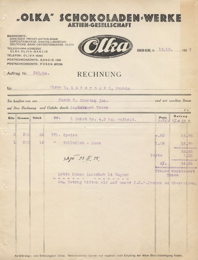 Olka. Schokoladenwerke. Rachunek z 12. 12. 1927 roku. Ze strony www.eBay.de.