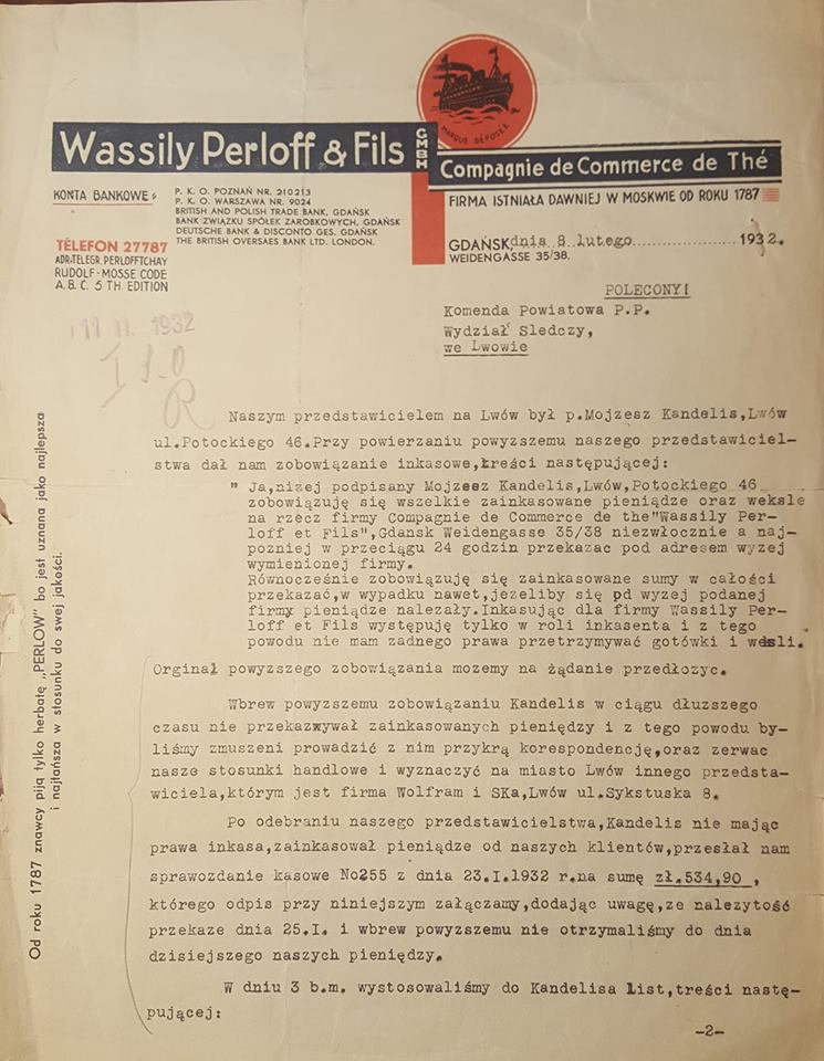 Pismo firmy Wassily Perloff & Fils do Policji we Lwowie. 1932. Zbiory Kuby Kowslaskiego (FB Dawne Przymorze).