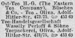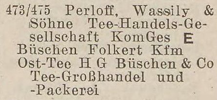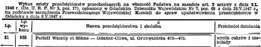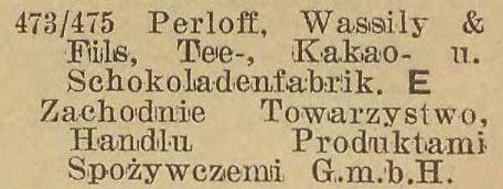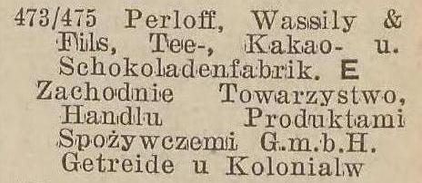 Firma „Compagnie de Commerce de The Wassily Perloff & Fils”, G.m.b.H. Gdańsk-Oliwa, Pommerschestrasse 107/109, istnieje w Gdańsku od dnia 5 V 1923 r. i jest zapisana do rejestru handlowego pod nr 10 HRB 1623/2 z dnia 12 VI 1923 r. Według zapisu w rejestrze handlowym firma jest spółką z o.o. (G.m.b.H.), faktycznie jednak stanowi wyłączną własność Żyda rosyjskiego dr. Arnolda Reichera, mieszkającego stale w Nicei wzgl. w Paryżu.