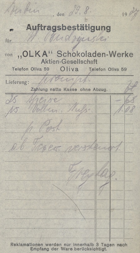 Olka. Schokoladenwerke. Paragon z 29. 08. 1927 roku. Zbiory Krzysztofa Gryndera.