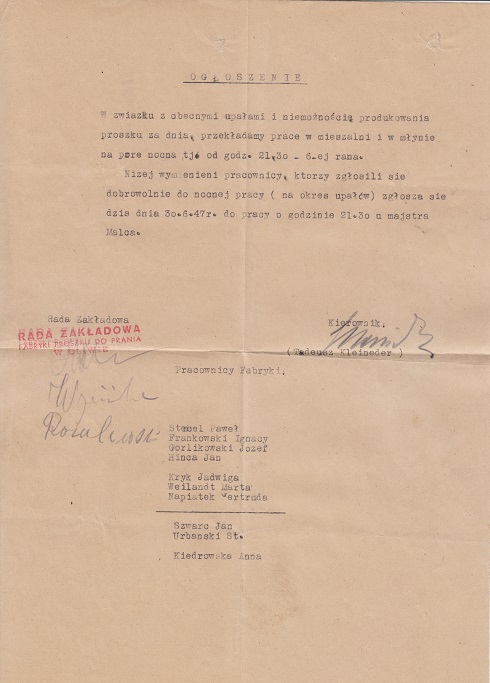 Zmiany godzin pracy w związku z upałami. Lato 1947 roku. Zbiory Piotra Leżyńskiego.