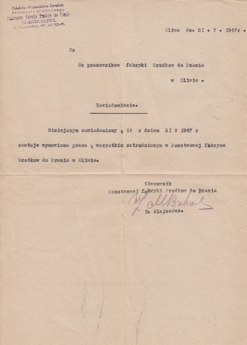 Wymówienie pracy wszystkim pracownikom z niem 31. 05. 1947 roku. Zbiory Piotra Leżyńskiego.