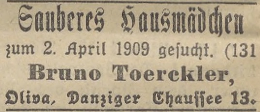 Bruno Toerckler. Olivaer Nachrichten z 07. 03. 1909 r. Ze strony www.Polona.pl.