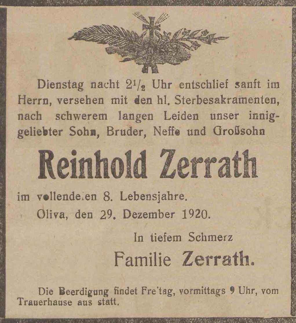 Reinhold Zerrath. Olivaer Zeintung nr 304 z 29. 12. 1920 r.